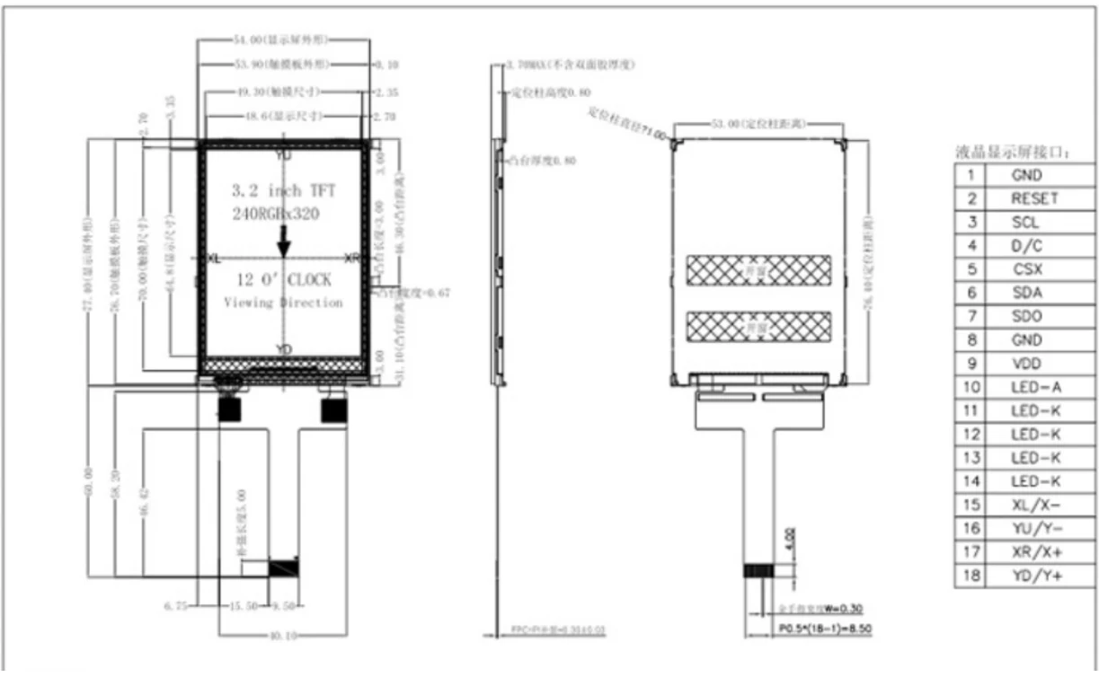 3,2 inch brede temperatuur IPS TFT Kleine TFT-aanraakschermmodule beschikt over een 4-draads SPI seriële interface, waardoor deze eenvoudig in een verscheidenheid aan ontwerpen kan worden geïntegreerd. De compacte afmetingen van 54,00 x 77,40 x 3,70 mm (B x L x D) zijn ideaal voor apparaten met beperkte ruimte, terwijl het actieve weergavegebied van 48,60 x 64,80 mm de weergavegrootte en draagbaarheid in evenwicht brengt, waardoor het een ideale keuze is voor industriële bedieningspanelen, draagbare testers en consumentenelektronica.
